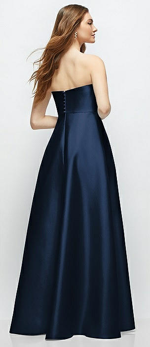 Strapless Satin Gown with Full Skirt and Covered Buttons at Back in midnight navy