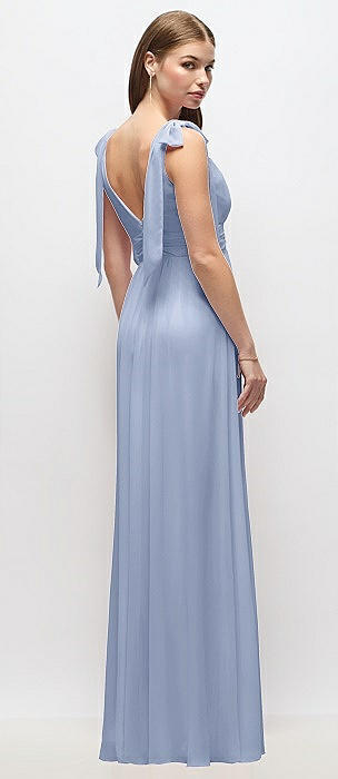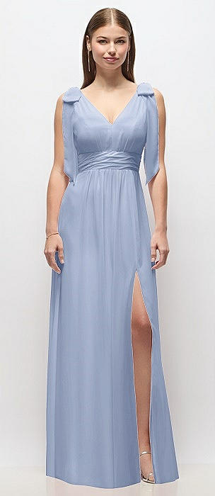 Plunge Neckline Bow Shoulder Empire Waist Chiffon Maxi Dress in sky blue