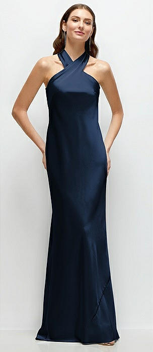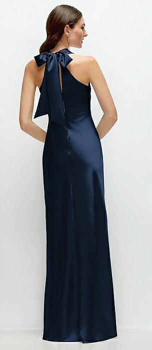 Pleated Halter Bias Satin Maxi Dress with Self-Tie Bow Back in midnight navy