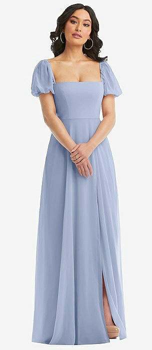 One-Shoulder Chiffon Maxi Dress with Shirred Front Slit in sky blue