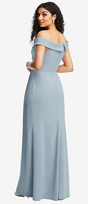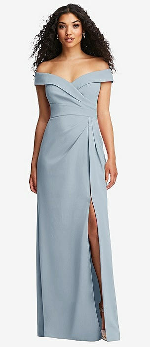 Cuffed Off-the-Shoulder Pleated Faux Wrap Maxi Dress in mist