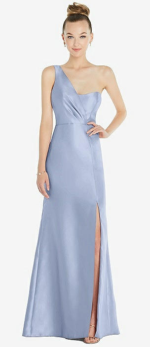 Draped One-Shoulder Satin Trumpet Gown with Front Slit in sky blue
