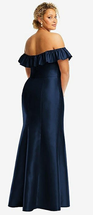 Off-the-Shoulder Ruffle Neck Satin Trumpet Gown in midnight navy