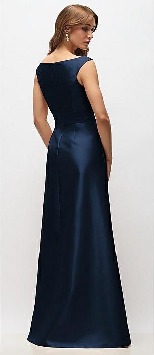 Off-the-Shoulder Draped Wrap Satin Maxi Dress in midnight navy
