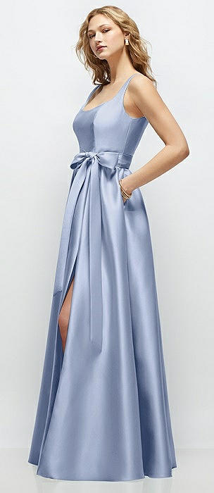Scoop Neck Drop Basque Skirt Satin Maxi Dress with Pockets in mist