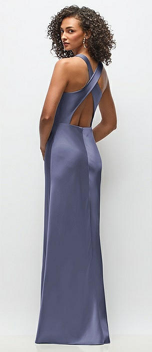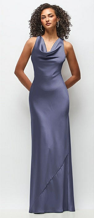 High-Neck Halter Stretch Satin Maxi Dress with Bias A-line Skirt in cloudy