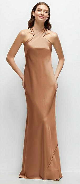 Plunge Halter Open-Back Maxi Bias Dress with Low Tie Back in toffee