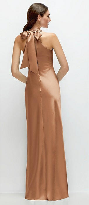 Pleated Halter Bias Satin Maxi Dress with Self-Tie Bow Back in toffee