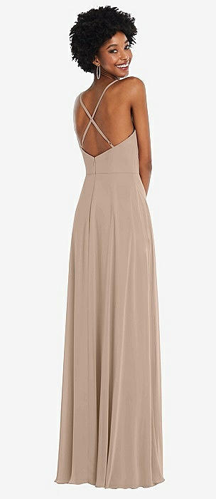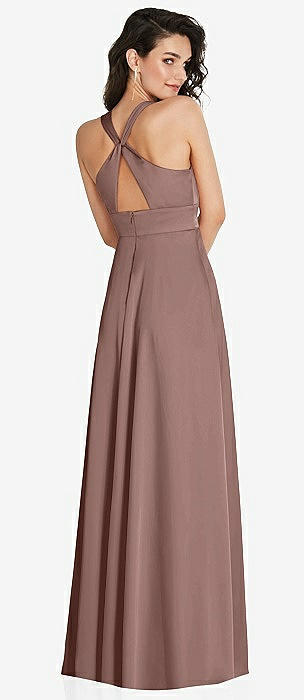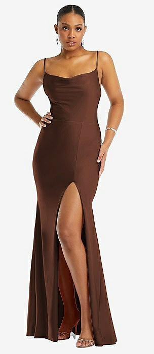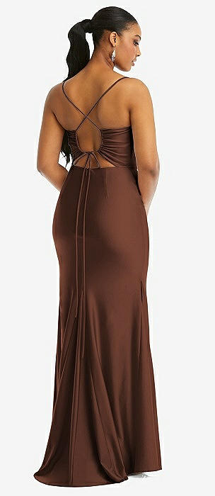 Cowl-Neck Open Tie-Back Stretch Satin Mermaid Dress with Slight Train in cognac