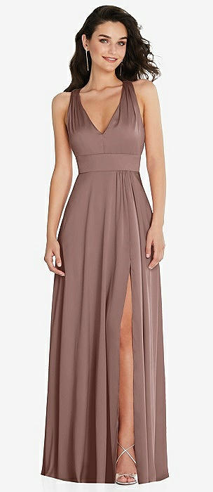 Shirred Shoulder Criss Cross Back Maxi Dress with Front Slit in sienna