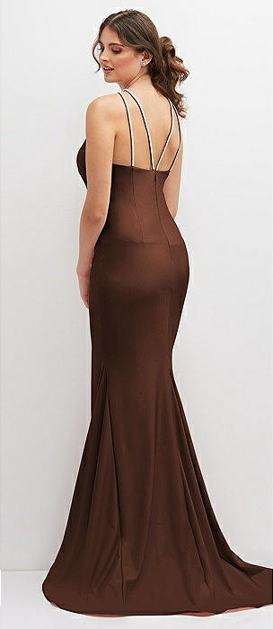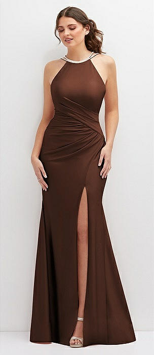 Halter Asymmetrical Draped Stretch Satin Mermaid Dress with Rhinestone Straps in cognac