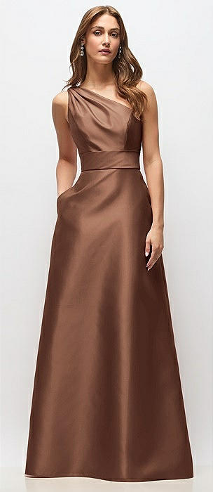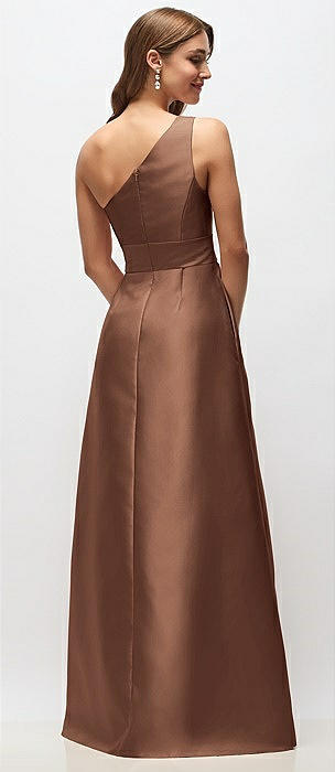 Draped One-Shoulder Satin Maxi Dress with Pockets in cognac