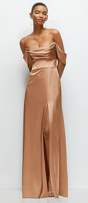 A-Line Satin Maxi Dress with Convertible Off-the-Shoulder or Strapless Looks in toffee