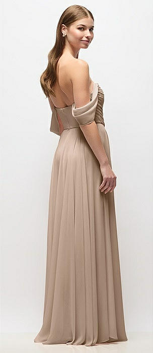 Strapless Draped Bodice Stretch Satin Column Maxi Dress in toffee