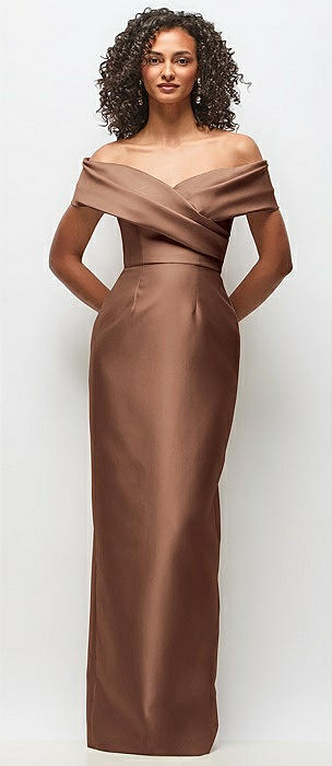 Draped Wrap Off-the-Shoulder Satin Column Floral Maxi Dress in cognac