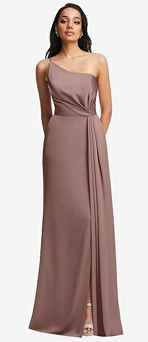 One-Shoulder Draped Skirt Satin Trumpet Gown in sienna