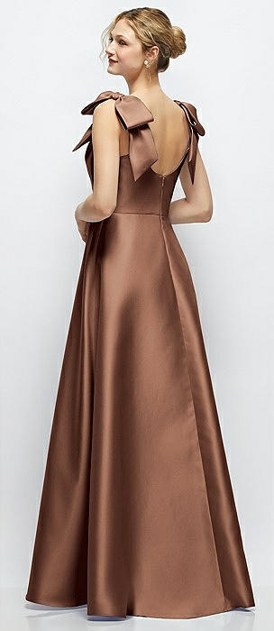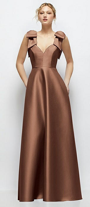 Deep V-Neck Satin Ball Gown with Shoulder Bows in cognac