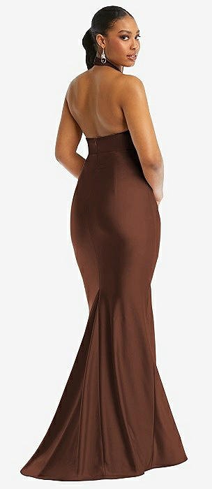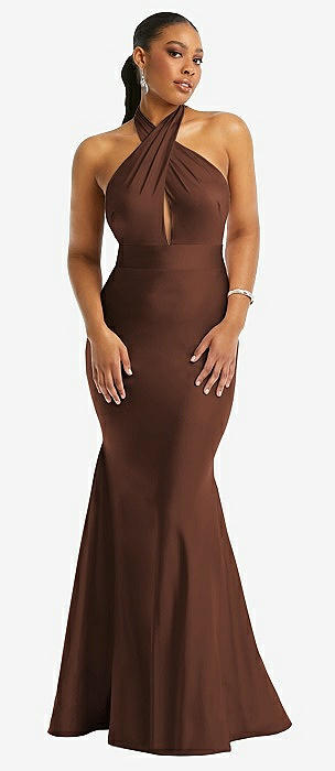 Criss Cross Halter Open-Back Stretch Satin Mermaid Dress in cognac