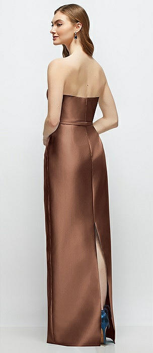 Strapless Satin Column Dress with Bow-Trimmed Skinny Belt in cognac