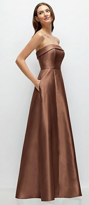 Strapless Bias Cuff Bodice Satin Gown with Pockets in cognac