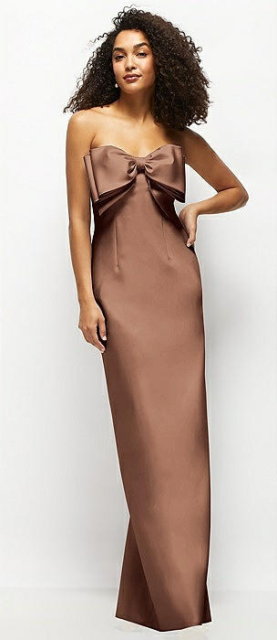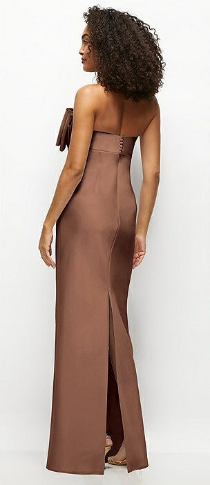 Strapless Satin Column Maxi Dress with Oversized Handcrafted Bow in cognac