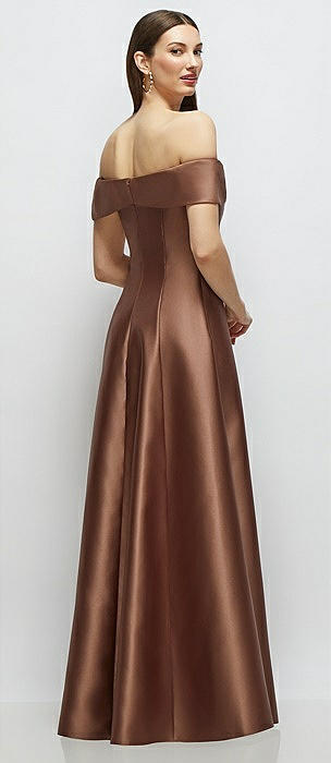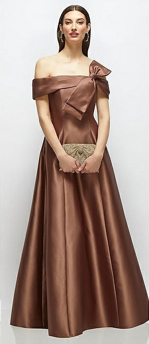 Asymmetrical Bow Off-Shoulder Satin Gown with Ballroom Skirt in cognac