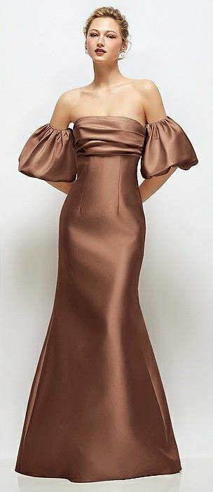 Shirred Shoulder Stretch Satin Mermaid Dress with Slight Train in cognac