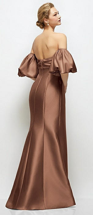 Off-the-Shoulder Puff Sleeve Satin Maxi Dress with Flared Skirt in cognac