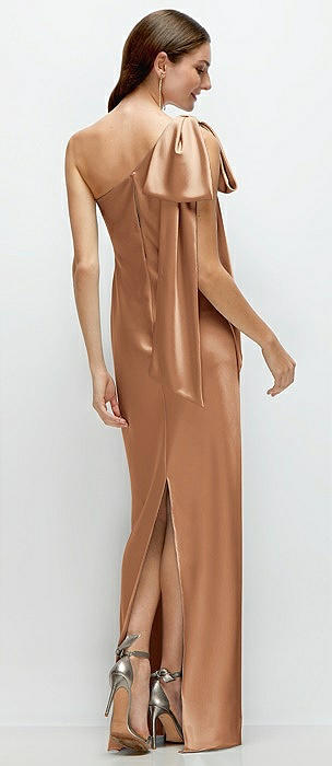 Stand Collar Bias Satin Maxi Dress with Self-Tie Bow Back in toffee