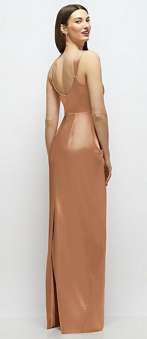Scoop Neck Draped Column Stretch Satin Maxi Dress in toffee