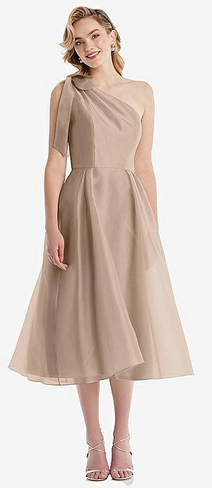Bow One-Shoulder Full A-Line Satin Maxi Dress in cognac