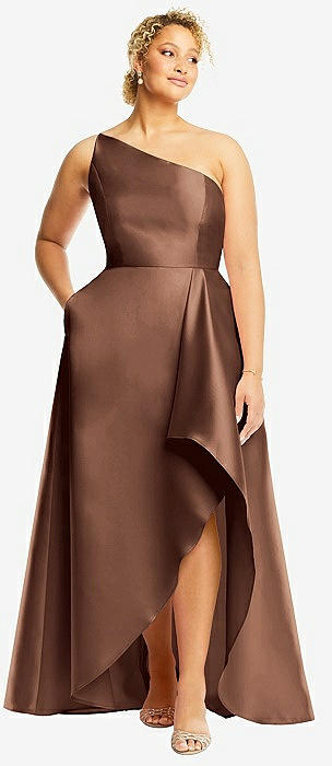 One-Shoulder Satin Gown with Draped Front Slit and Pockets in cognac