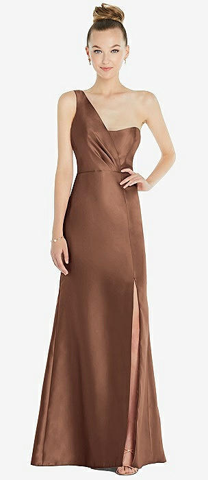 Draped One-Shoulder Satin Trumpet Gown with Front Slit in cognac