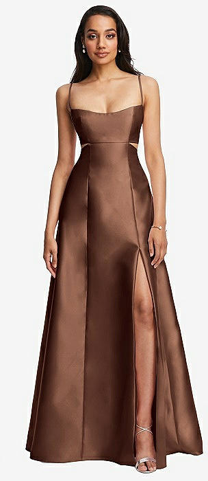Open Neckline Cutout Satin Twill A-Line Gown with Pockets in cognac