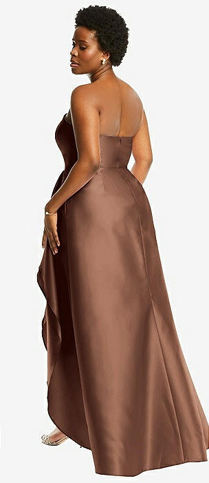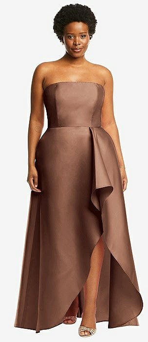 Strapless Satin Gown with Draped Front Slit and Pockets in cognac