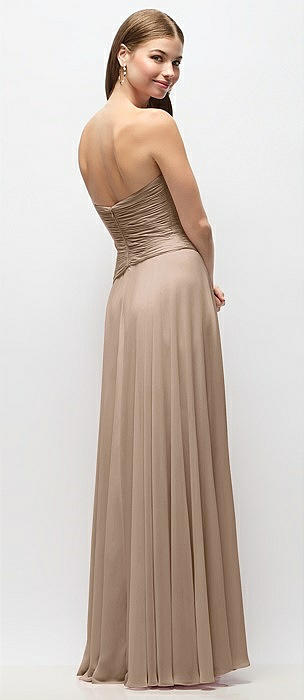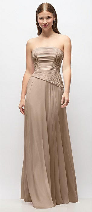 Strapless Satin Drop Waist Gown with Full Skirt in cognac