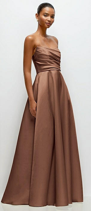 Strapless Draped Cat-Eye Satin Maxi Dress with Full Skirt in cognac