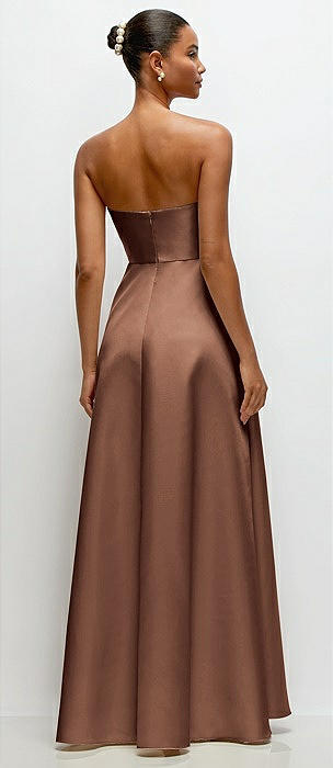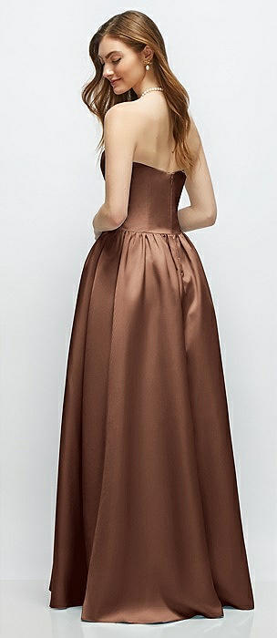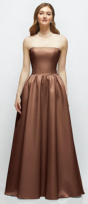 Strapless Satin Drop Waist Gown with Full Skirt in cognac