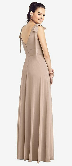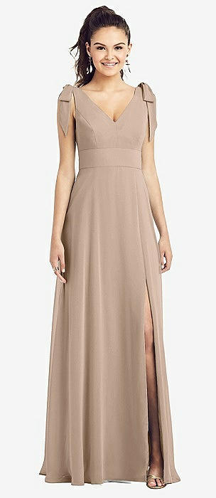 Bow-Shoulder V-Back Chiffon Gown with Front Slit in topaz