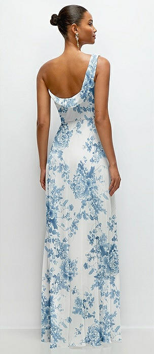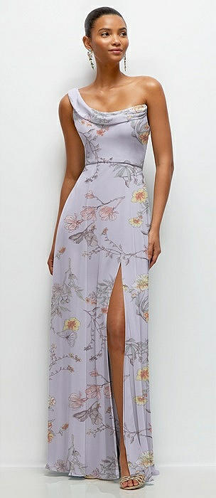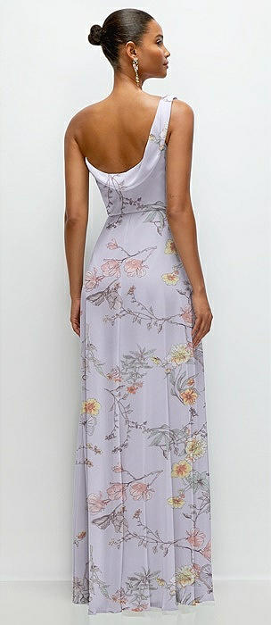 Chiffon One-Shoulder Maxi Dress with Draped Cowl Neckline in butterfly botanica silver dove
