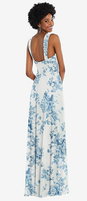 Cowl Neck Chiffon Maxi Dress with Hand-Worked Petal Straps in cottage rose dusk blue
