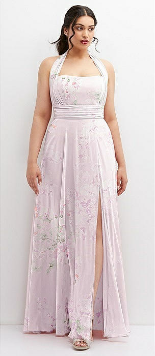 Stand Collar Halter Maxi Dress with Criss Cross Open-Back in blush garden