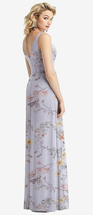 Bow-Shoulder V-Back Chiffon Gown with Front Slit in butterfly botanica silver dove