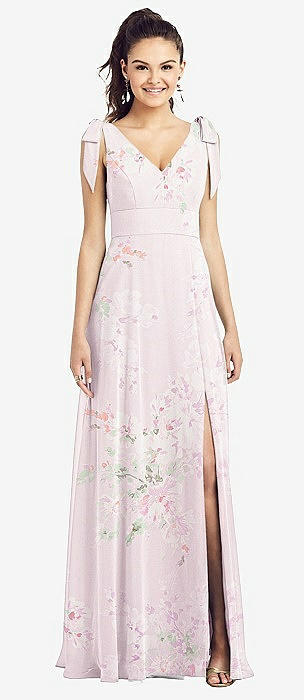 Bow-Shoulder V-Back Chiffon Gown with Front Slit in blush garden