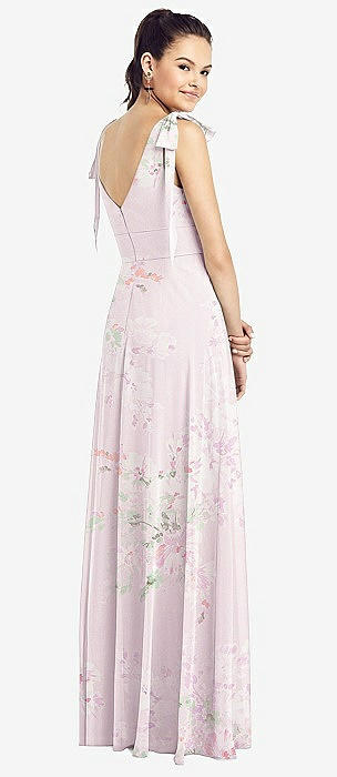 Bow-Shoulder V-Back Chiffon Gown with Front Slit in coquette floral print