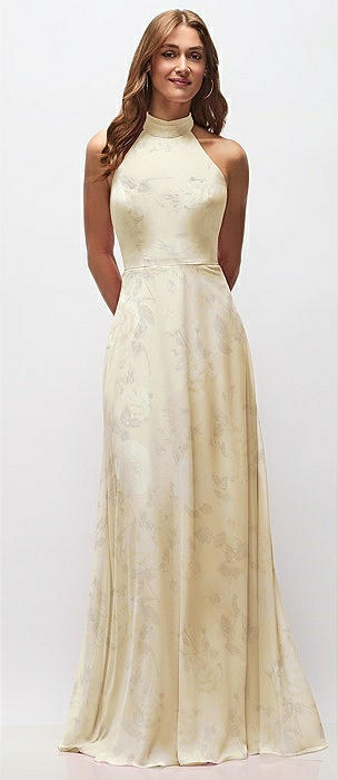 High-Neck Halter Floral Stretch Satin Maxi Dress with Bias A-line Skirt in vintage primrose evergreen