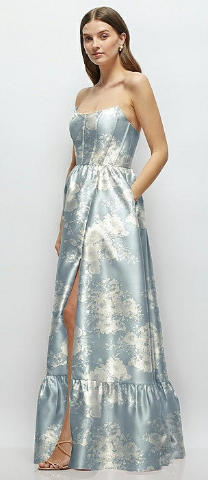 Floral Strapless Cat-Eye Boned Bodice Maxi Dress with Ruffle Hem in porcelain blue seraphina floral