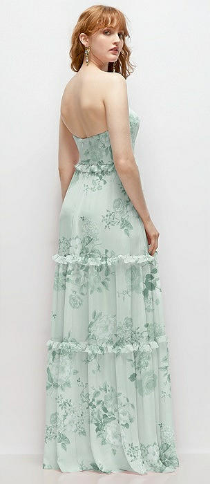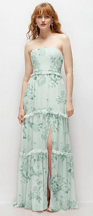 Strapless Chiffon Maxi Dress with Tiered Micro Ruffle Full Skirt in mint green floral