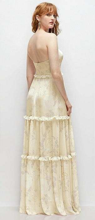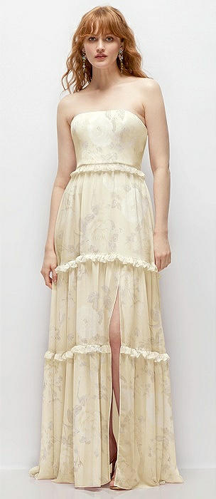 Strapless Chiffon Maxi Dress with Tiered Micro Ruffle Full Skirt in butter yellow floral