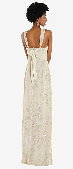 Draped Chiffon Grecian Column Gown with Convertible Straps in butter yellow floral